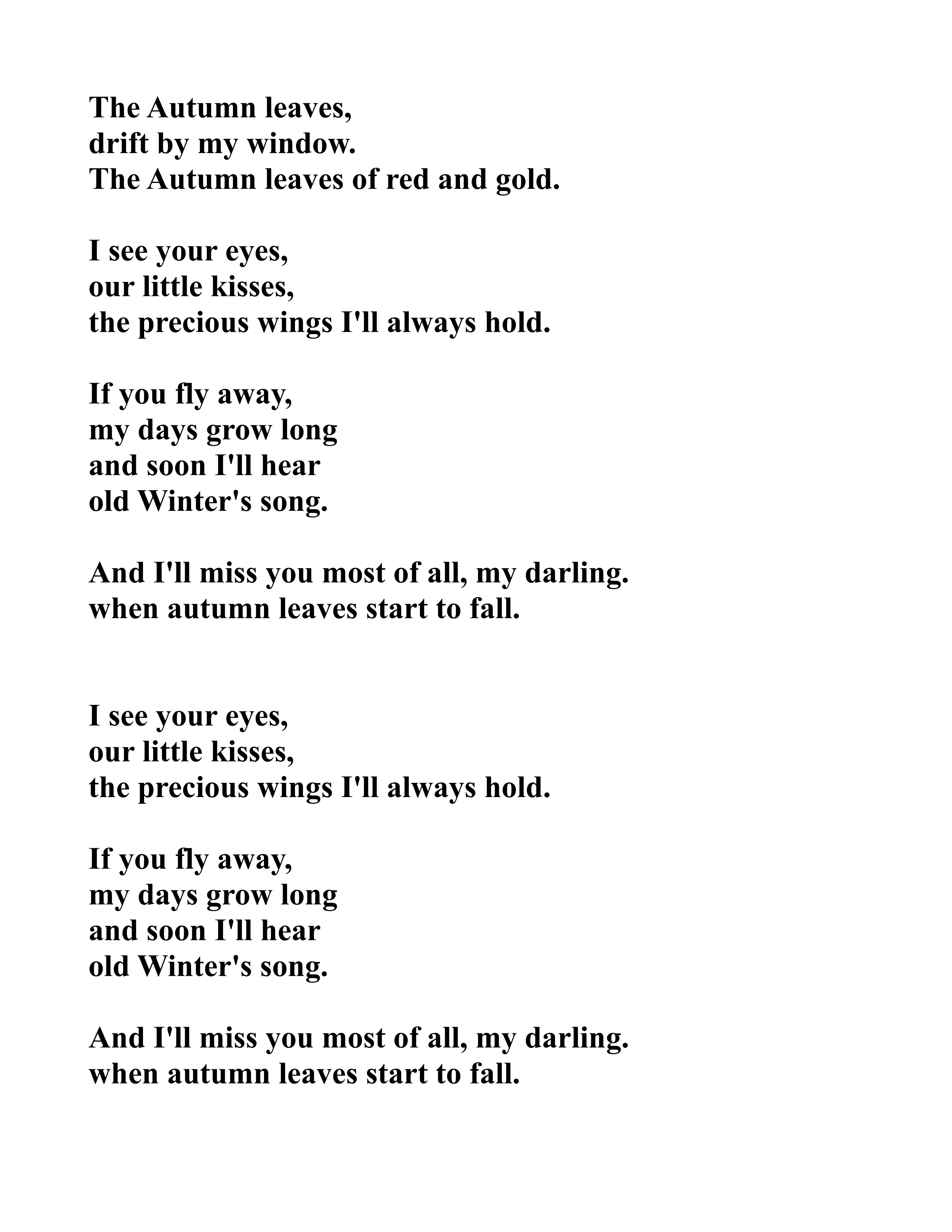 "Autumn Leaves" is the English-language lyrical adaptation of the French song "Les Feuilles mortes" ("The Dead Leaves") composed by Joseph Kosma in 1945. The original lyrics were written by Jacques Prévert in French, and in 1950 Johnny Mercer wrote the English lyrics.