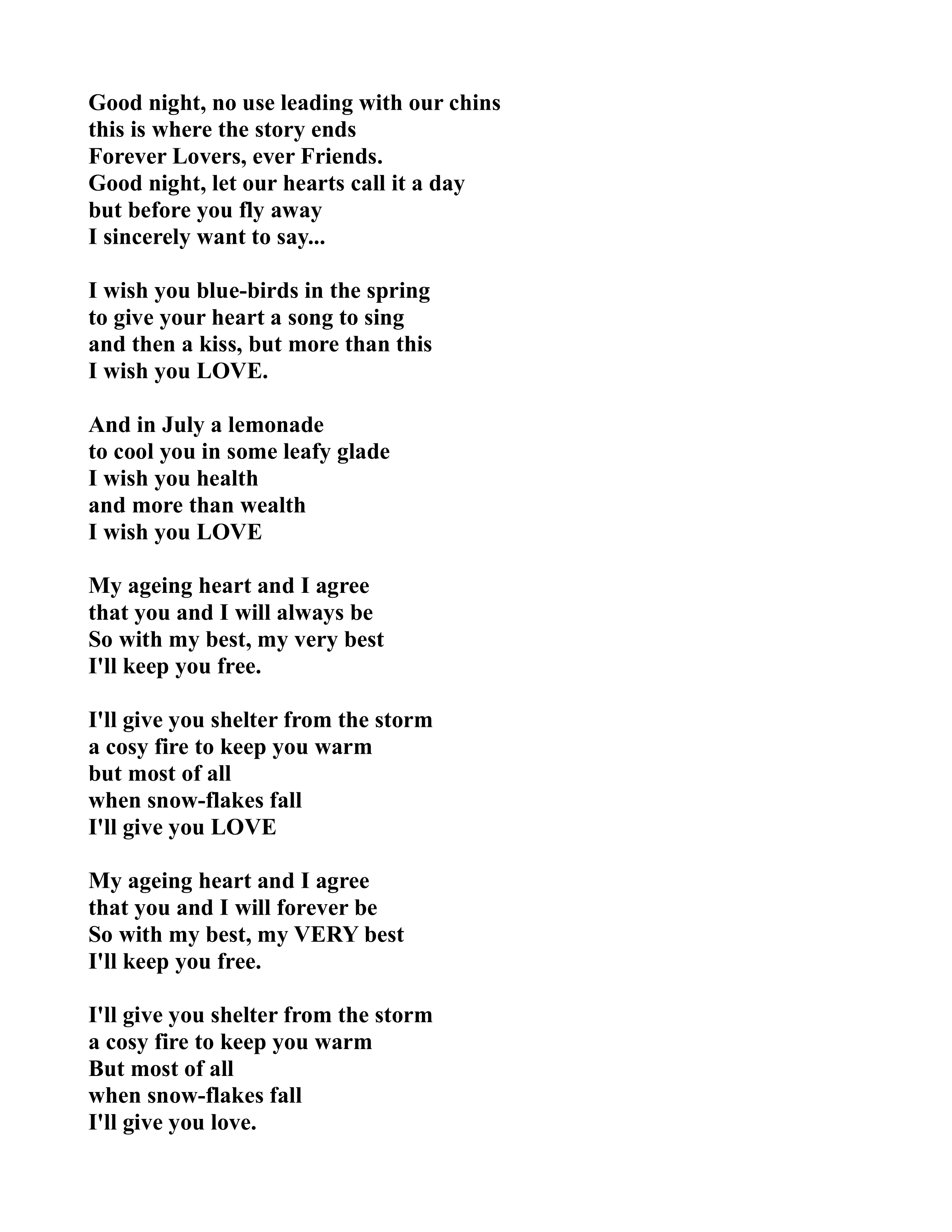 "My aging heart and I agree that you and I will forever be. SO with my best, my very best, I'll keep you free."